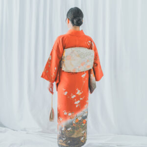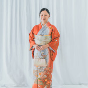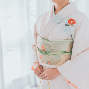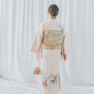 上質な「ちりめん」地の玉子色。女性らしさを引き立てる優しい地色に、華やかな柄行が美しく映えます。