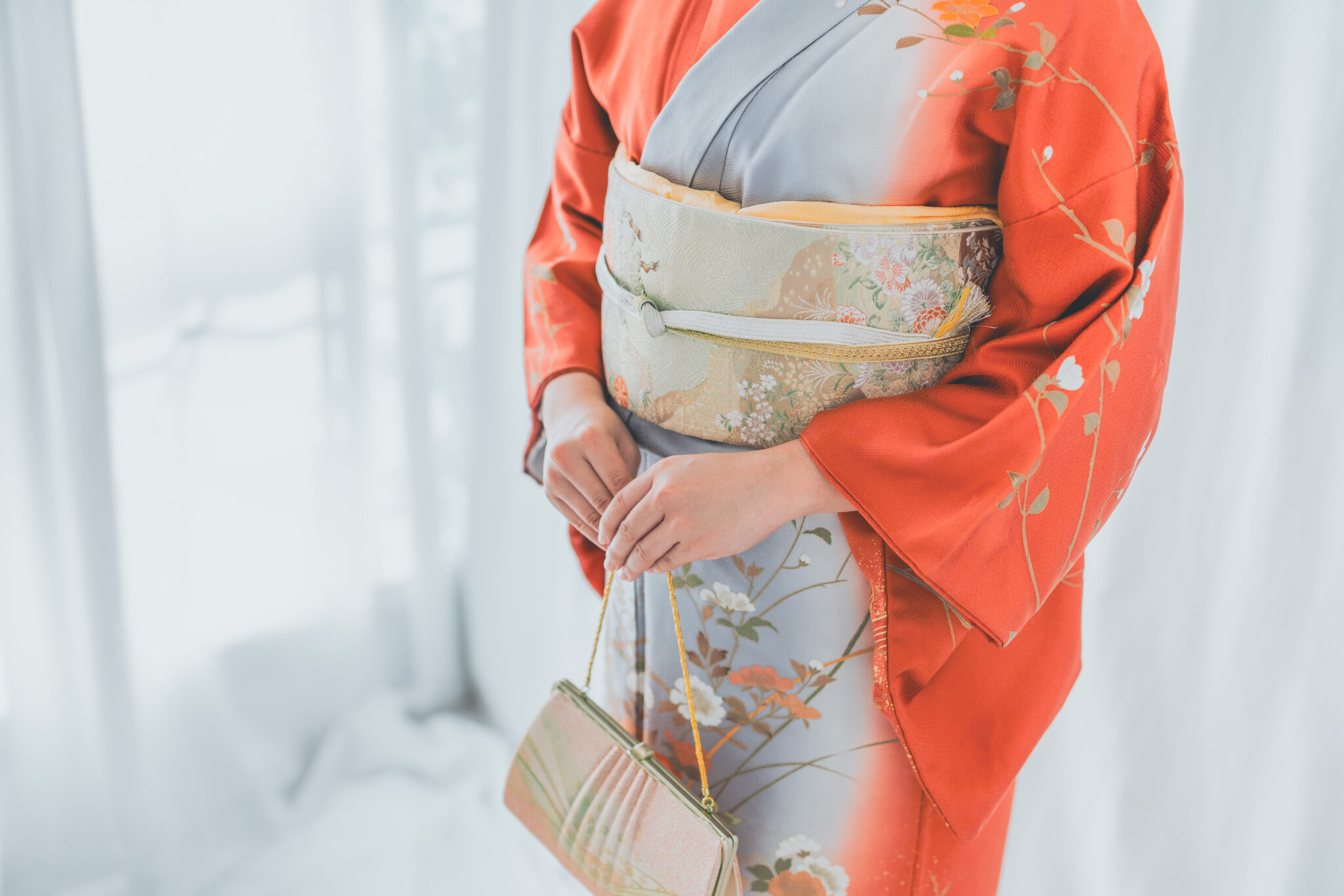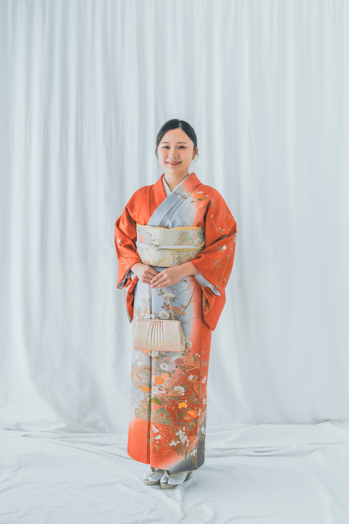 鮮やかな紅梅色に、青海波の地紋と花の刺繍が施された優美な一着。光の加減で表情を変える艶やかな着姿を楽しめます。