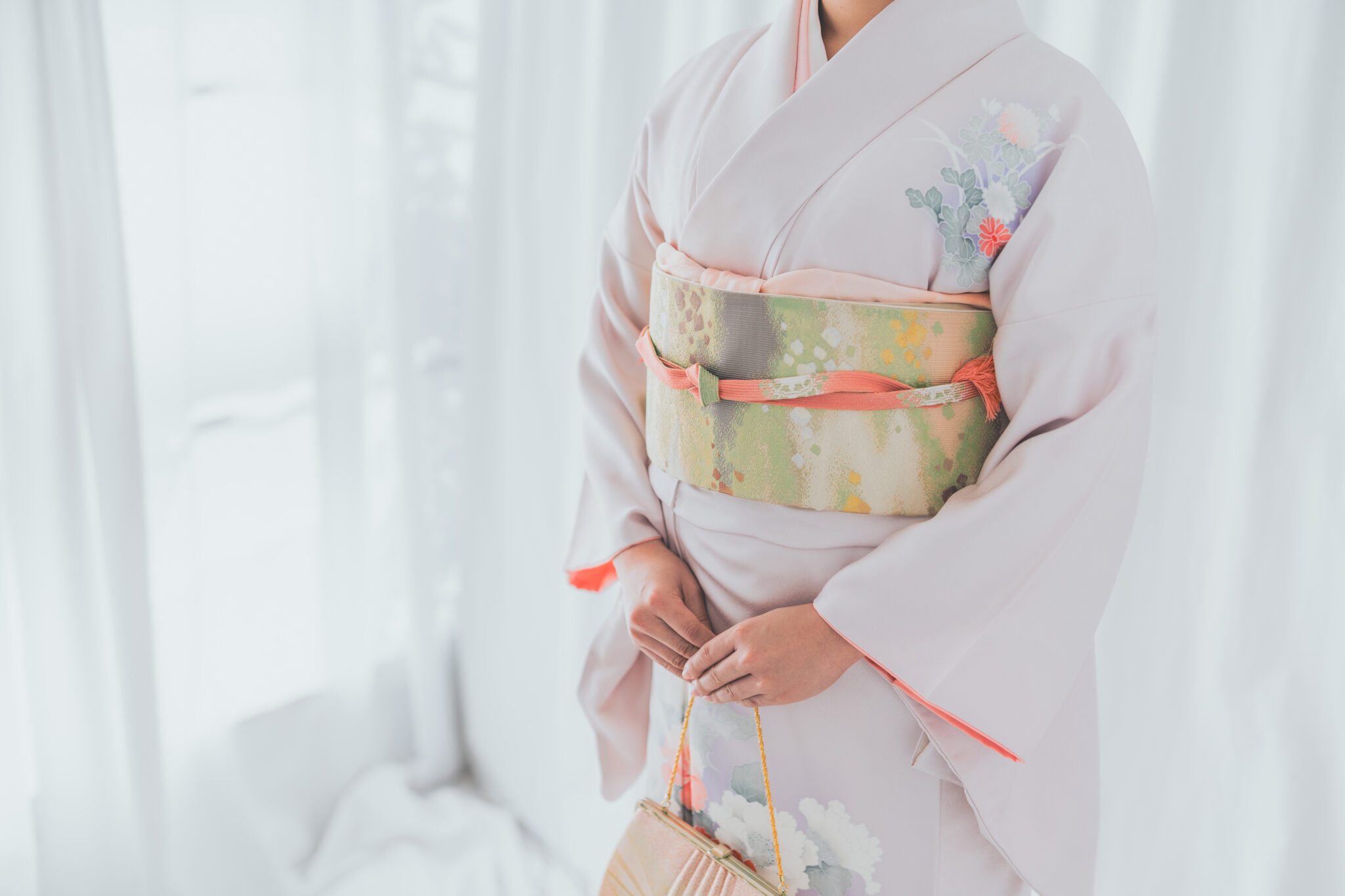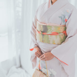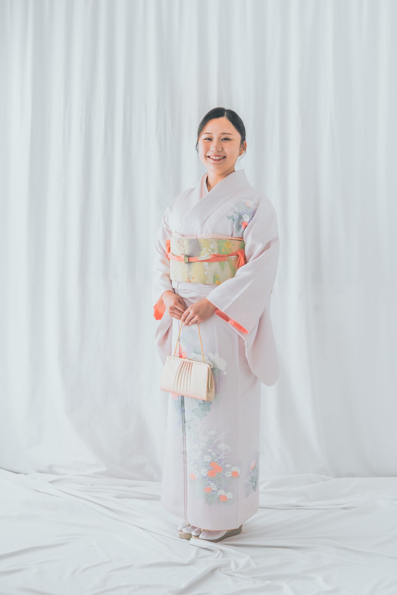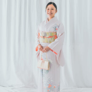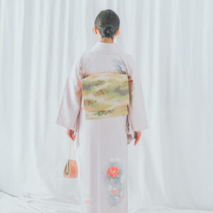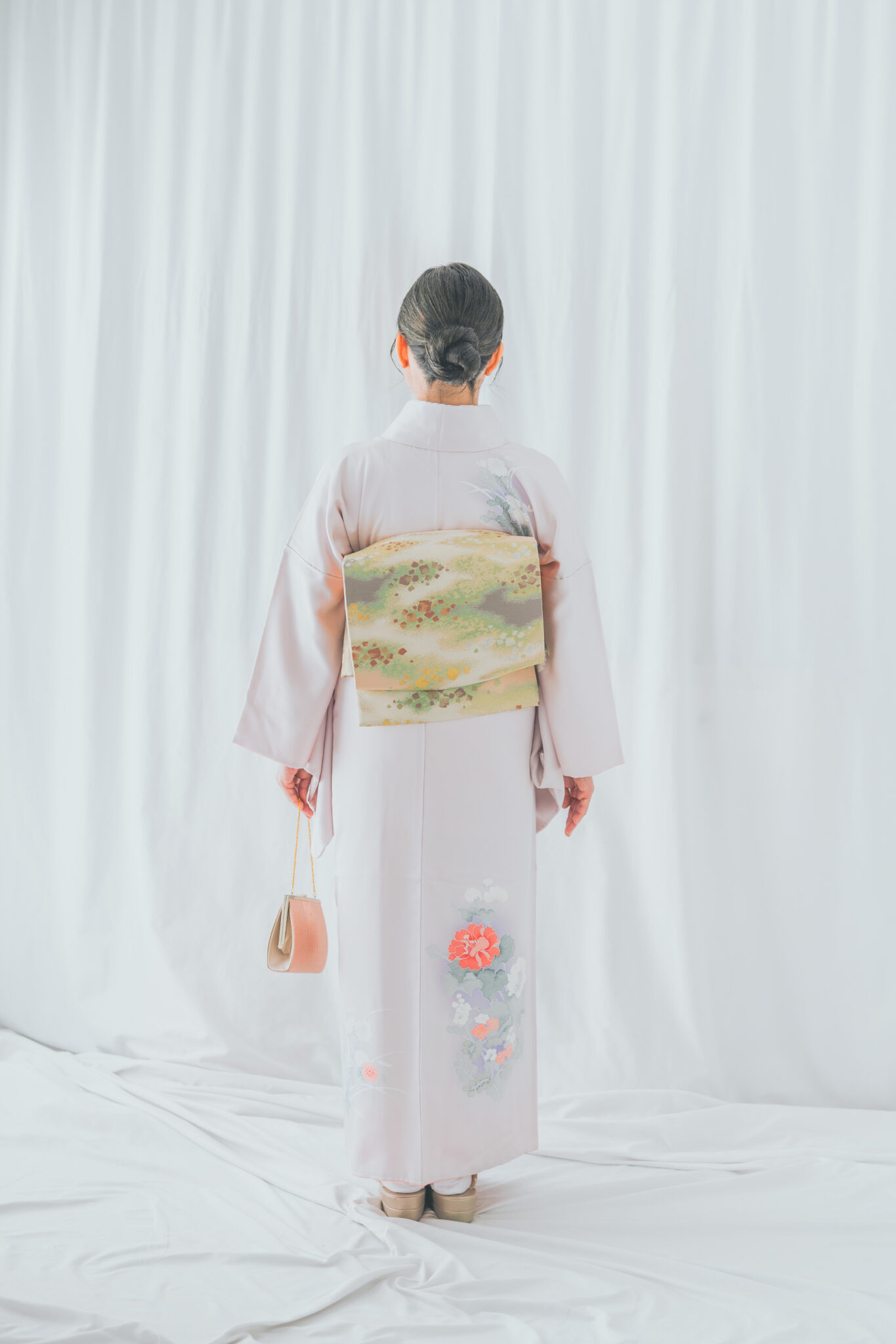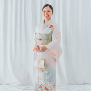 優しい桜色に若竹色のアクセント。清楚な辻が花のラインが美しく、気品ある大人の品位を感じさせる装いです。